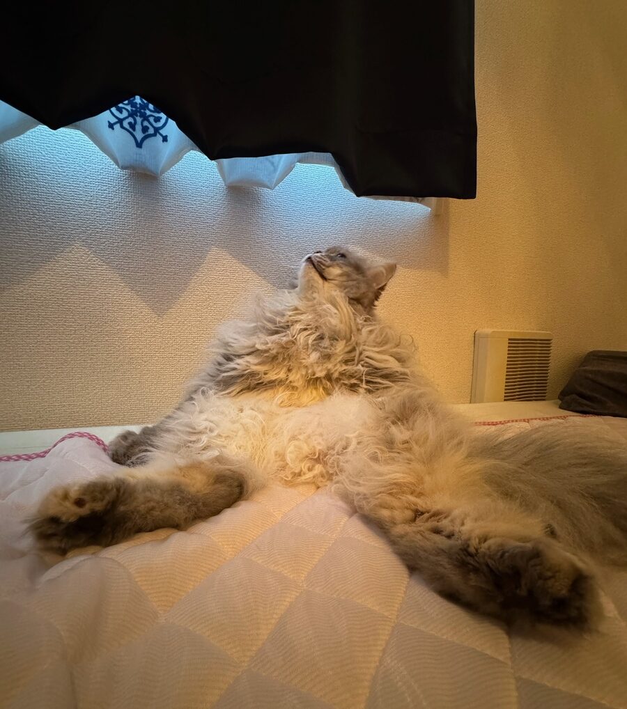 このまま毛繕いが始まるのですが、カーテンの向こうの窓の外が気になる様子