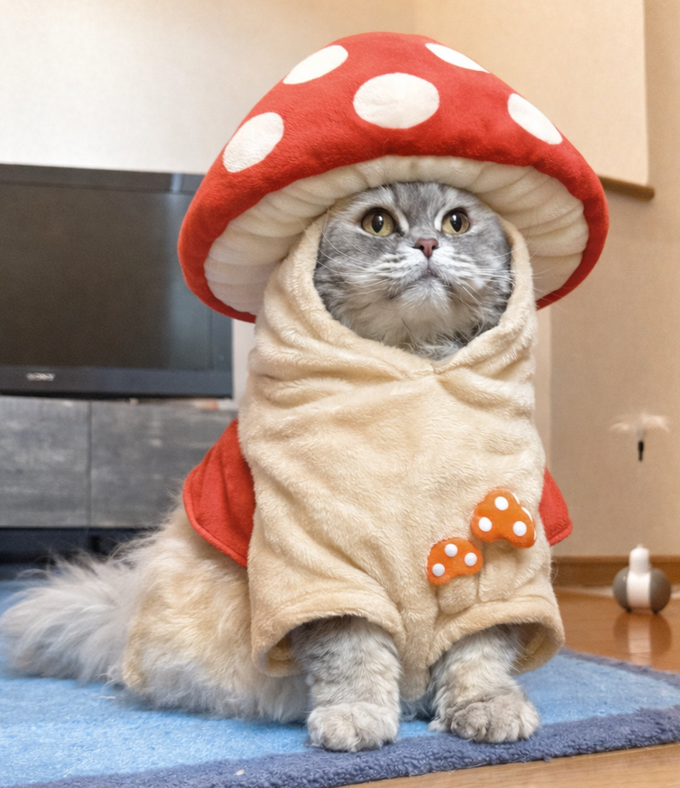 『きのこの着ぐるみを着たエマ』