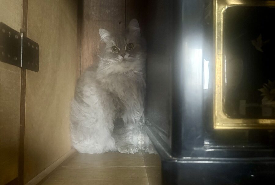 初めて実家に連れて帰った時から、エマが好んで入ろうとする仏壇の裏。